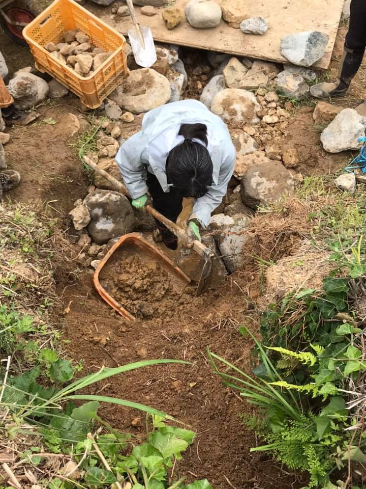 湧き水地点の上部の崩れてきている壁面も、床堀りをして石を積む準備をしていきます。
